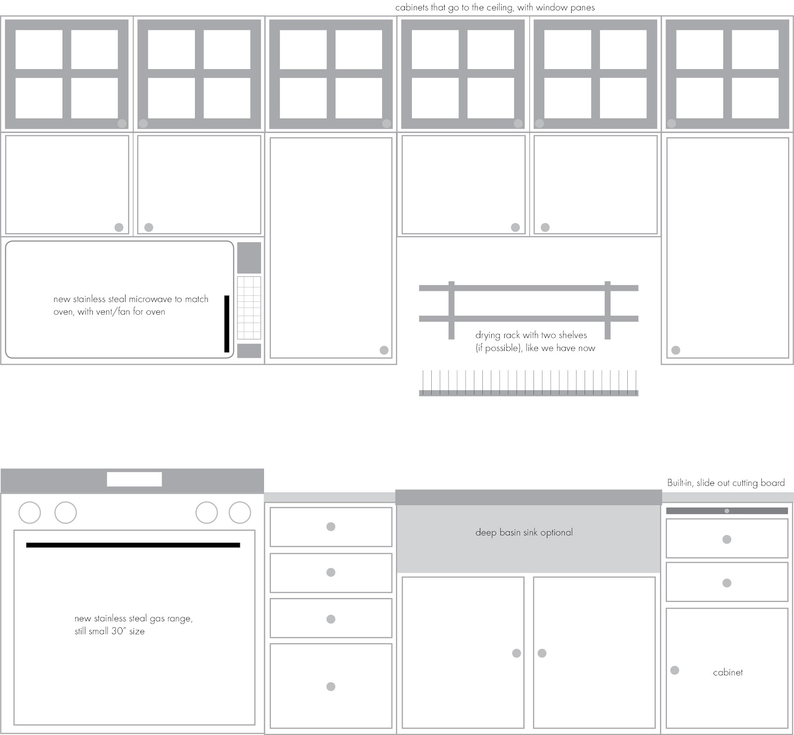 My original renderings had the microwave above the stove, which is learned is not going to work. Since our stove is only 20" wide (yes, I said 20"), we'd need to have a 20" or even a 24" hanging microwave, which do not exist. Barney suggested building a shelf to put the microwave on, but that goes against all fire codes. We decided to build the shelf on the right side of the kitchen and shorten those cabinets. We are installing a range hood above the stove, but still run into the problem of the size. Lowes doesn't make a 20" range hood, so we're having to go with a 24" option. Fine, we'll make it work....